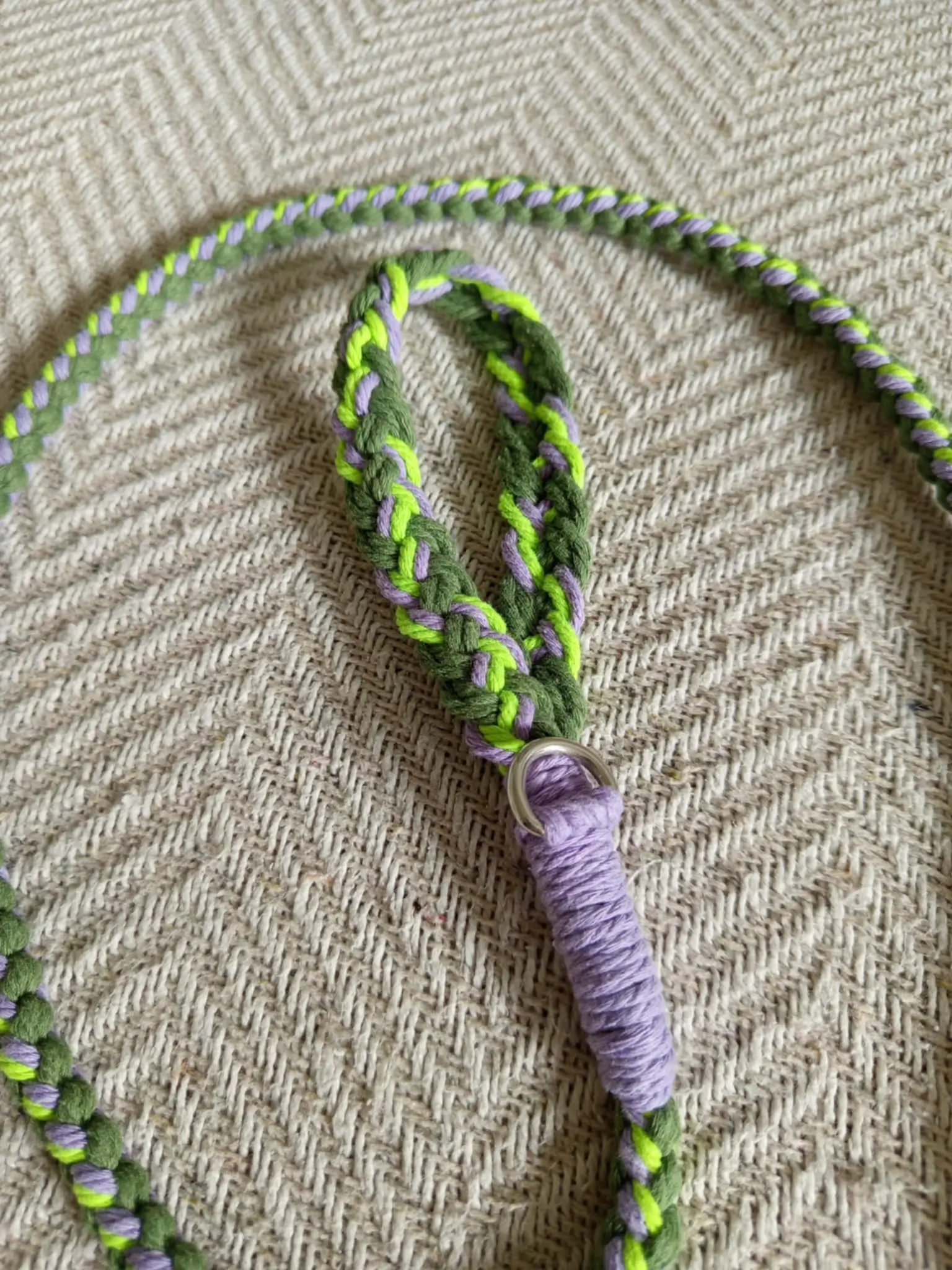 Couleurs des fils : mauve, kaki et vert fluo