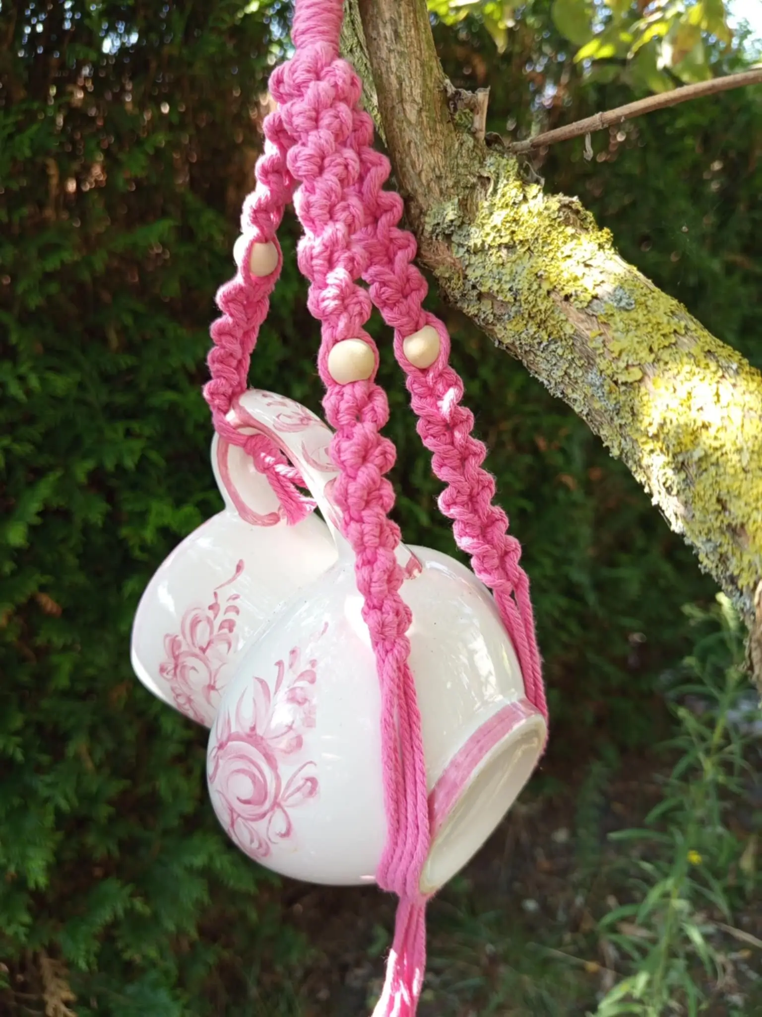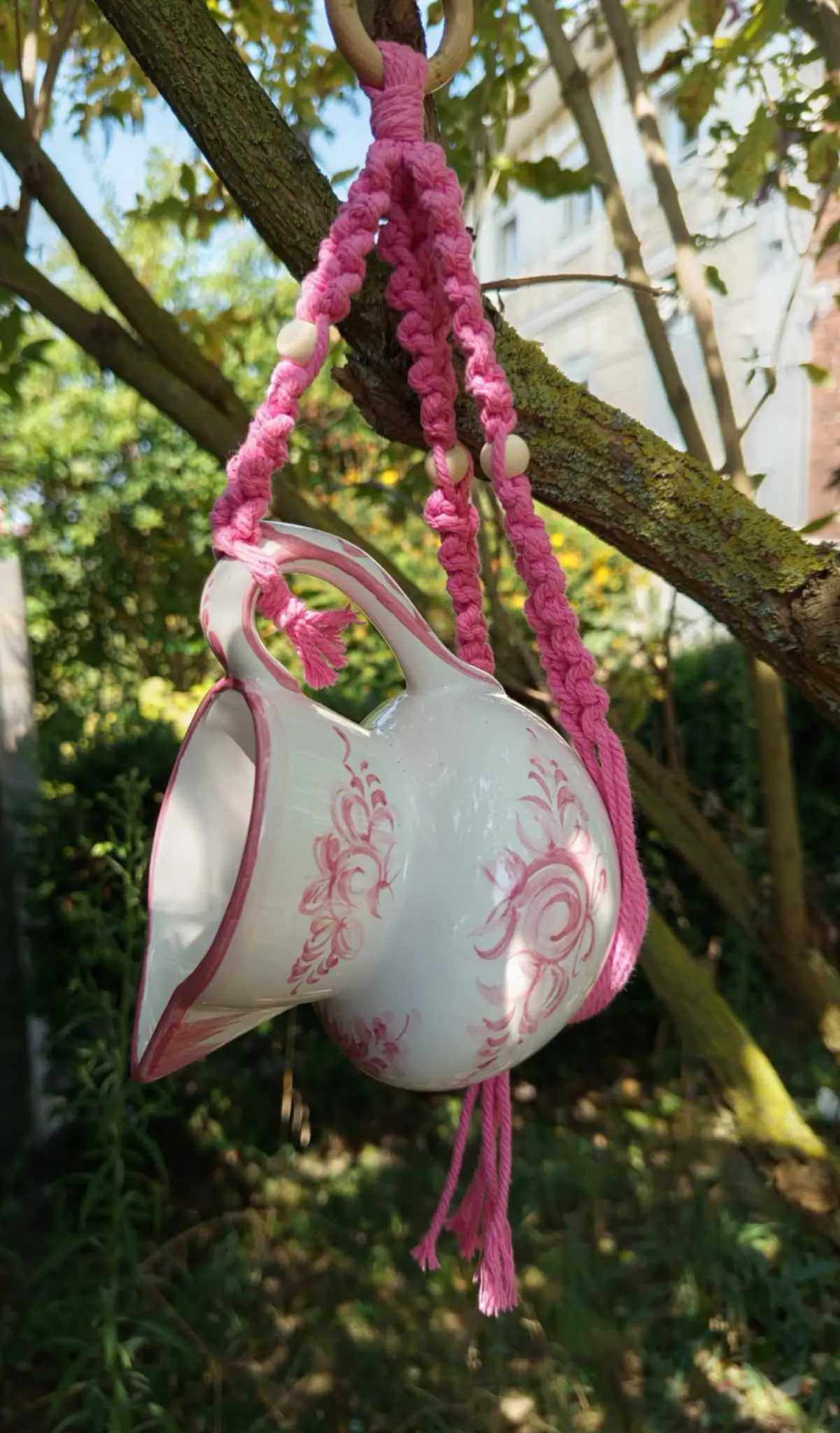 Ravissez-les en leur proposant ma création de mangeoire - Modèle Colibri - : avec son tissage particulier de nœuds en forme de fleurs.